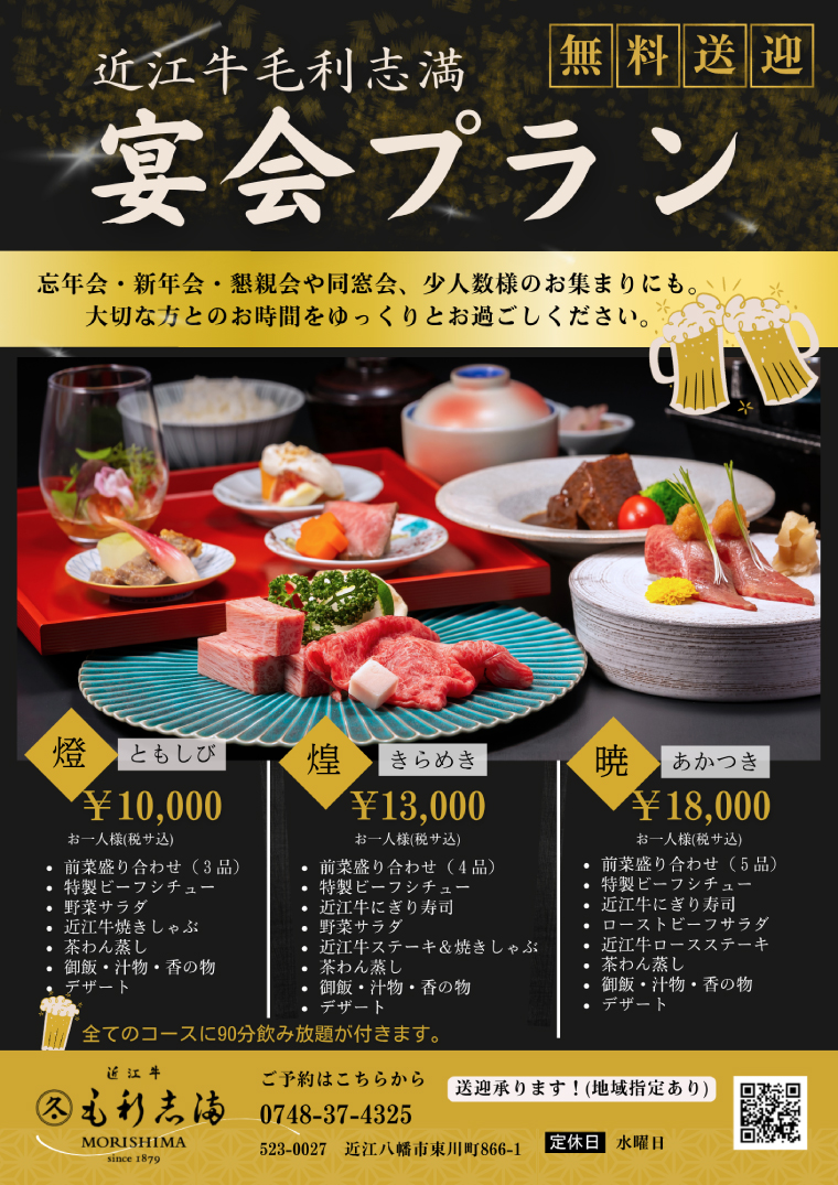 宴会プラン シェフが織りなす近江牛肉の美を味わう New 宴会プラン 近江八幡店では、忘年会・新年会・懇親会等 少人数のパーティーでご利用いただける飲み放題付のプランをご用意致しました。 ※前日までの要予約となります。 CATERING SERVICES 近江牛毛利志満近江八幡店が自信をもってお届けする、ゆっくりおうちで記念日などを楽しめるケーリングサービスをご用意致しました。 毛利志満からのお知らせ 25年10月26日 店舗情報【ご案内】宴会プランリニューアル 25年10月22日 店舗情報【おすすめ】12月4日&5日 Le Lien Dinner2025のご案内 25年10月19日 出展情報日本橋高島屋「第46回グルメのための味百選」出店のお知らせ 25年10月16日 店舗情報【長浜黒壁店 営業時間変更と臨時休業のお知らせ】 25年10月11日 メディア関連情報店舗情報日本最大級のプレゼント専門サイト「ギフトモール」に掲載されました 25年10月11日 店舗情報【近江八幡店】11月18日(火)ランチタイム貸し切り営業のお知らせ 毛利志満 近江八幡店 0748-37-4325 毛利志満からのお知らせ記事リスト 25年10月26日 店舗情報 【ご案内】宴会プランリニューアル 25年10月22日 店舗情報 【おすすめ】12月4日&5日 Le Lien Dinner2025のご案内 25年10月19日 出展情報 日本橋高島屋「第46回グルメのための味百選」出店のお知らせ 25年10月16日 店舗情報 【長浜黒壁店 営業時間変更と臨時休業のお知らせ】 25年10月11日 メディア関連情報店舗情報 日本最大級のプレゼント専門サイト「ギフトモール」に掲載されました 25年10月11日 店舗情報 【近江八幡店】11月18日(火)ランチタイム貸し切り営業のお知らせ